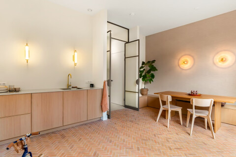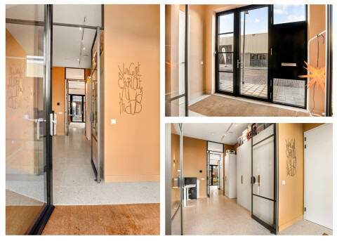 Begane grond: entree, kantoorruimte met grote kastenwand, (fietsen)berging met open voorraadkasten, wasmachine en droger. Deur naar hal, badkamer met douche, wastafel en wc. Ruime achterkamer met pantry (v.v. koelkast en vaatwasser) en grote raampartij met zicht op het terras en de gezamenlijke tuin. Vanuit de hal via trap naar: