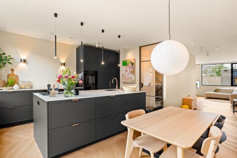 Eerste verdieping: overloop met glazen deuren naar de woonkamer aan de voorzijde en de keuken aan de achterzijde. De woonkamer staat in open verbinding met de keuken en eetkamer. De luxe keuken is voorzien van een grote koelkast en vriezer, inductiekookplaat (Bora) met ingebouwde afzuiger, Quooker kraan, afwasmachine en twee ovens. Trap naar: