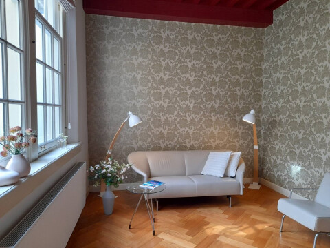 Gelijkvloers: Ruime elegante inkomhal, toilet, drie kamers (multifunctioneel), één ervan is momenteel in gebruik als ontvangstruimte, maar kan worden gebruikt als logeer slaapkamer (17m2). De andere kamers kunnen worden gebruikt als werk/studeerkamer of extra zitkamer (7,5m2 en 13m2). Nieuwe moderne badkamer met douche, wastafel en toilet. Bijkeuken met toegang tot de binnentuin. Toegang vanuit de hal naar het souterrain met wijnkast (16 m2) en toegang tot;