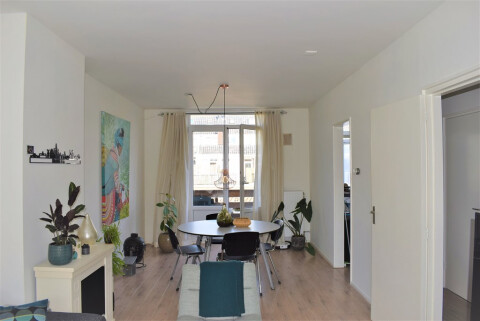 1e verdieping: overloop/hal, WC, garderobe. L-vormige woonkamer, met aan de voorzijde een fijn werk/studeerplekje en aan de achterzijde een deur naar het balkon. Semi-open keuken met inbouwapparatuur (gasfornuis, oven, vaatwasser, koel/vriescombinatie) en deur naar het balkon. Vanuit de hal trap naar: