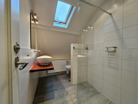 1e verdieping: ruime overloop, 2 slaapkamers (ca. 3.55 x 3.00 m. en 1.95 x 3.00/3.60m.) beiden met houten vloer. Kast met wasmachine en-droger. Badkamer met inloopdouche, wastafel en toilet.