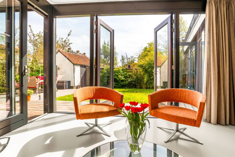 De L-vormige woonkamer is door middel van kasten en aankleding slim verdeeld in aparte ruimtes, waardoor er een aparte lees/speelruimte, zitgedeelte en eetgedeelte is gecreëerd. Doordat de gehele achtergevel van het huis gemaakt is van hoogwaardig isolatieglas, met een schuifdeur en drie openslaande deuren, is ieder deel van het de woonkamer heel licht. Er is vloerverwarming over de gehele begane grond en daarnaast geeft de gas gestookte haard gezelligheid. Vanuit de woonkamer kijk je over de tuin met pergola/overkapping met een zitgedeelte met houten vlonders. Een achterom, trampoline, schuur en extra terras maken dit tot een prachtige tuin om heerlijke te vertoeven.