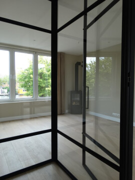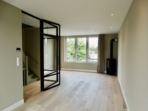 1e verdieping: hal met toilet en kapstok. Glazen deuren naar de woonkamer met een sfeervolle kachel, uitzicht over het Spaarne aan de voorzijde en openslaande deuren naar het balkon aan de achterzijde op het westen. Moderne open keuken voorzien van koelkast, vriezer, gaskookplaat, vaatwasser, Quooker (warmwaterkraan) en oven. Trap naar;