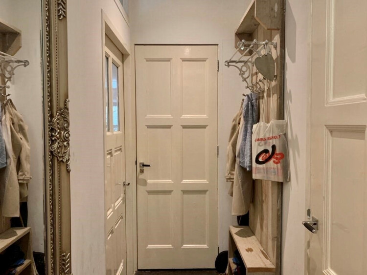 Begane grond: entree, toilet met fonteintje. Woonkamer met moderne open keuken, voorzien van inbouwapparatuur. openslaande deuren naar de achtertuin.