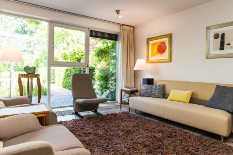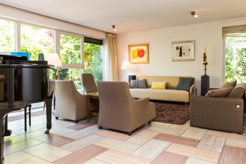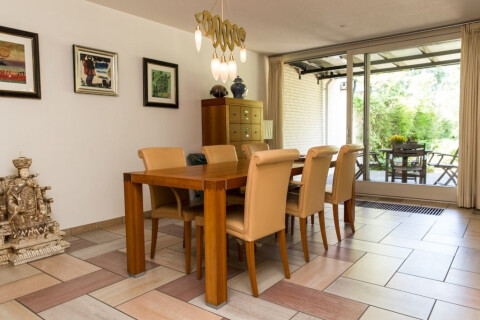 Begane grond: overdekte entree, ruime hal, modern toilet. De begane grond is volledig voorzien van vloerverwarming. Luxe keuken (2014) met diverse inbouwapparatuur ( Miele stoomoven, combi oven/magnetron, Liebherr koelkast, vriezer en wijnkast, vaatwasser en 5-pits rvs gaskookplaat). Bijkeuken (3.42 x 1.58 m.) met veel kastruimte en aansluiting voor wasmachine en -droger. Toegang tot de garage (5.62 x 3.42 m.). Ruime woonkamer (46 m2) met grote raampartijen met uitzicht over de fraai aangelegde tuin en het achterliggende park. Via een schuifpui toegang tot het overdekte terras (3.43 x 2.93 m.) Trap naar: