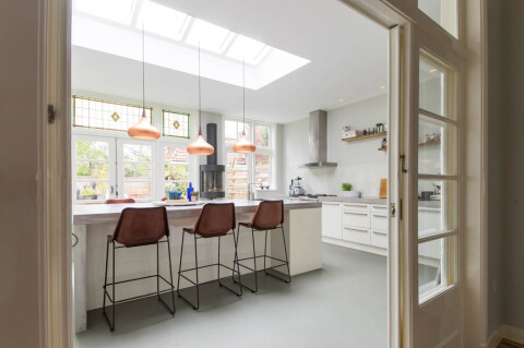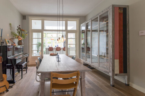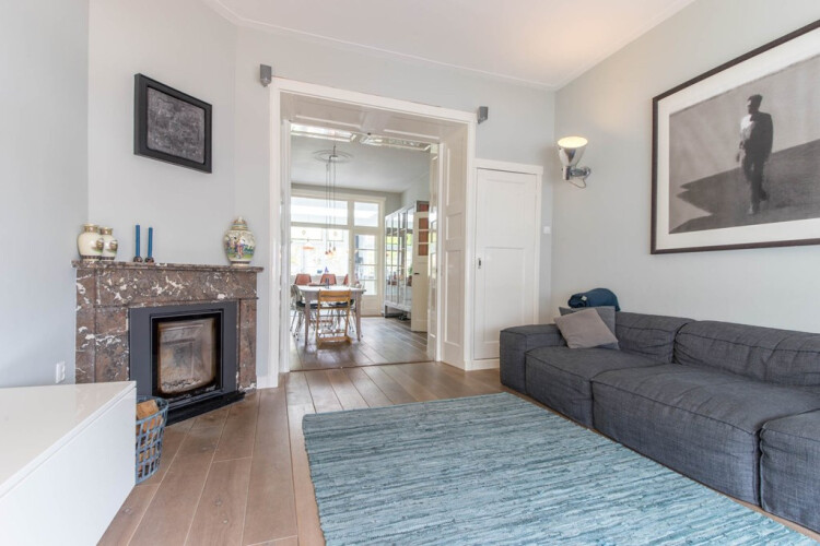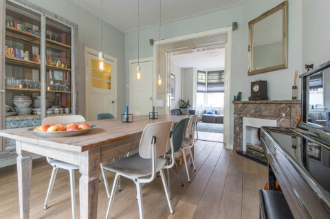 Begane grond: entree, vestibule met originele wandtegels en garderobe. Gang, diepe trapkast, gastentoilet en bijkeuken/voorraadkamer met veel bergruimte voor bijv. sportspullen. Ruime woonkamer (ca. 5.42 x 3.95 m.) met open haard en ensuite eetkamer (ca. 5.09 x 3.95 m.) met gashaard, beide kamers voorzien van fraaie houten vloer. De keuken is gescheiden van de eetkamer door suitedeuren en recent volledig gemoderniseerd en uitgebouwd (oppervlakte maar liefst 30m2 !). Centraal in de keuken is een kook/ziteiland met spoelbak, vaatwasser en kastruimte. Daarnaast is er een grote koelkast met vriesgedeelte (en er is een extra vriezer in de bijkeuken), een extra breed gasfornuis, een grote (gas)oven, combi-oven/magnetron en een stoomoven. De vloerverwarming en gashaard zorgt ervoor dat het in de keuken altijd heerlijk behaaglijk is. Vanuit de keuken geven openslaande deuren toegang tot de achtertuin (15.50 x 6.25 m.) die gelegen is op het noorden, toch vrijwel de hele dag zonnig doordat de zon vanuit het oosten en westen open toegang heeft.