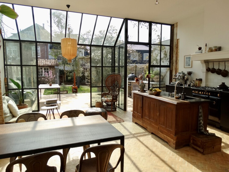 Begane grond: entree, vestibule met kapstok, gang met marmeren vloer en toilet. Ruime woon- en eetkamer (beide ca. 4 x 4.3 m.) met houten vloer, gescheiden door suitedeuren. In de zitkamer is een goed werkende open haard en in de middenkamer een prachtige sierschouw. De fraaie keuken (ca. 6 x 5.4 m.) bevindt zich in de volledig glazen uitbouw, met mooie Marokkaanse klinkers die doorlopen in het aan de keuken grenzende terras. Kookeiland met Quooker-kraan, vaatwasser, gootsteen met afvalmaler en kastruimte. Koel/vriescombinatie, fornuis met 2 ovens, een grill en 4 gaspitten plus wokbrander. Diepe tuin op het zuiden met fraai uitzicht op de kathedraal, terras en buitenkeuken.