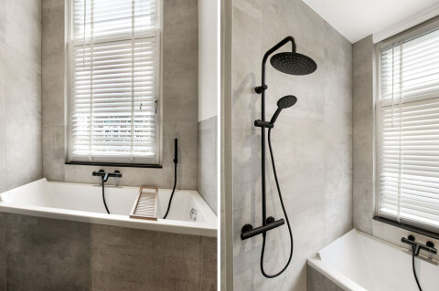 De luxe, recent vernieuwde badkamer is voorzien van een ligbad, separate douche, dubbele wastafel met zwarte kranen en een toilet.
