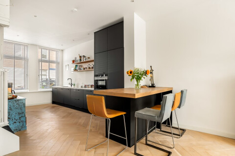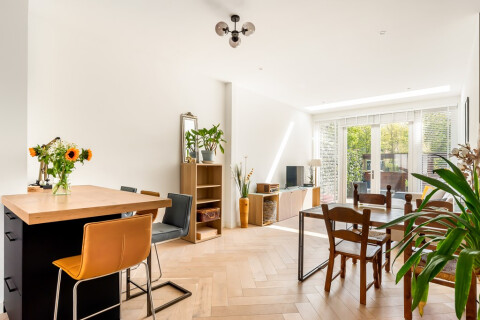 Begane grond: Entree, hal met toilet. De begane grond heeft vloerverwarming. Woonkamer en moderne open keuken. De keuken is uitgerust met Quooker kraan, ingebouwde inductie kookplaat met geïntegreerde afzuiger, combimagnetron, koel/vriescombinatie en ontbijtbar voor 4 personen. Eet/woongedeelte heeft openslaande deuren naar de tuin, welke een achterom heeft naar het park.