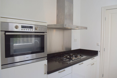 Parterre: entree, hal, modern toilet, lichte woonkamer (ca. 25 m²) met openslaande deuren naar de zonnige achtertuin, moderne keuken met inbouwapparatuur (koelkast, vaatwasser, combimagnetron, kookplaat en afzuigkap), badkamer met douche, wastafelmeubel en aansluiting voor wasmachine en -droger.