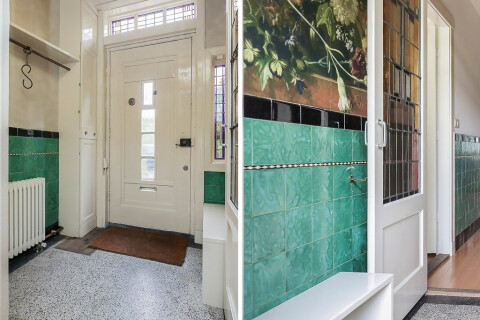 Het grote plantsoen waar het huis aan ligt, is groen en biedt vrij uitzicht plus veel privacy, want geen directe overburen. De vele originele details als granitovloeren, betegelde lambriseringen, glas-in-lood en paneeldeuren maar ook de warme kleurkeuze geven de woning zijn typische 30-er jaren maar ook een specifieke eigen sfeer.