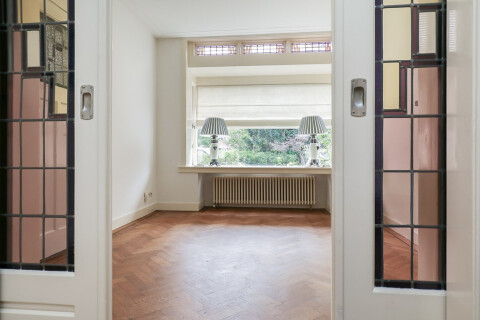 Lichte woonkamer met sfeervolle erker aan voorzijde, een marmer schouw en verbinding met de eetkamer door 2 nog originele glas in lood schuifdeuren.