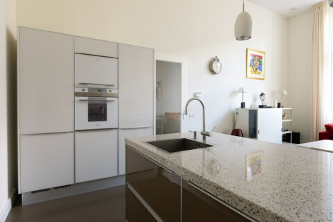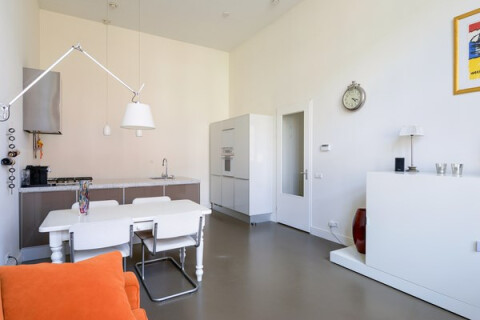 Hal met bergruimte (loft). Ruime, lichte woonkamer (7.21 x 4.15 m.) met hoge raampartijen. Moderne, open keuken met ingebouwde koelkast en vriezer, oven, ruimte voor een magnetron, vaatwasser, 5-pits gasfornuis met afzuigkap en kookeiland met meer dan genoeg kastruimte. Twee slaapkamers (3.64 x 2.95 and 3.64 x 3.21 m.), beide met hoge plafonds en ramen. Badkamer met ligbad, inloopdouche, wastafel en aansluiting voor een wasmachine en droger. Apart toilet.