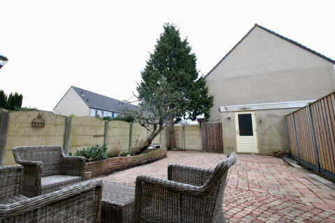 Entree met toilet en trapkast. Woonkamer met open keuken, met nieuwe inrichting v.v. inbouwapparatuur (oven, koelkast/vriezer, inductiekookplaat met ingebouwde afzuiging, afwasmachine en Quooker-kraan). Deur naar de achtertuin op het zuid-westen met stenen schuur en achterom. Trap naar: